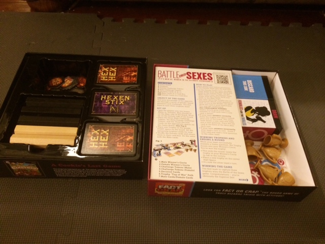 I went ahead and compared it to Hex Hex XL: One contains about three really good games, with complete instructions, three decks, about two-dozen cardboard pieces, and five hunks of wood. The other one? Same size, not even a third of the components. Just… Why?
